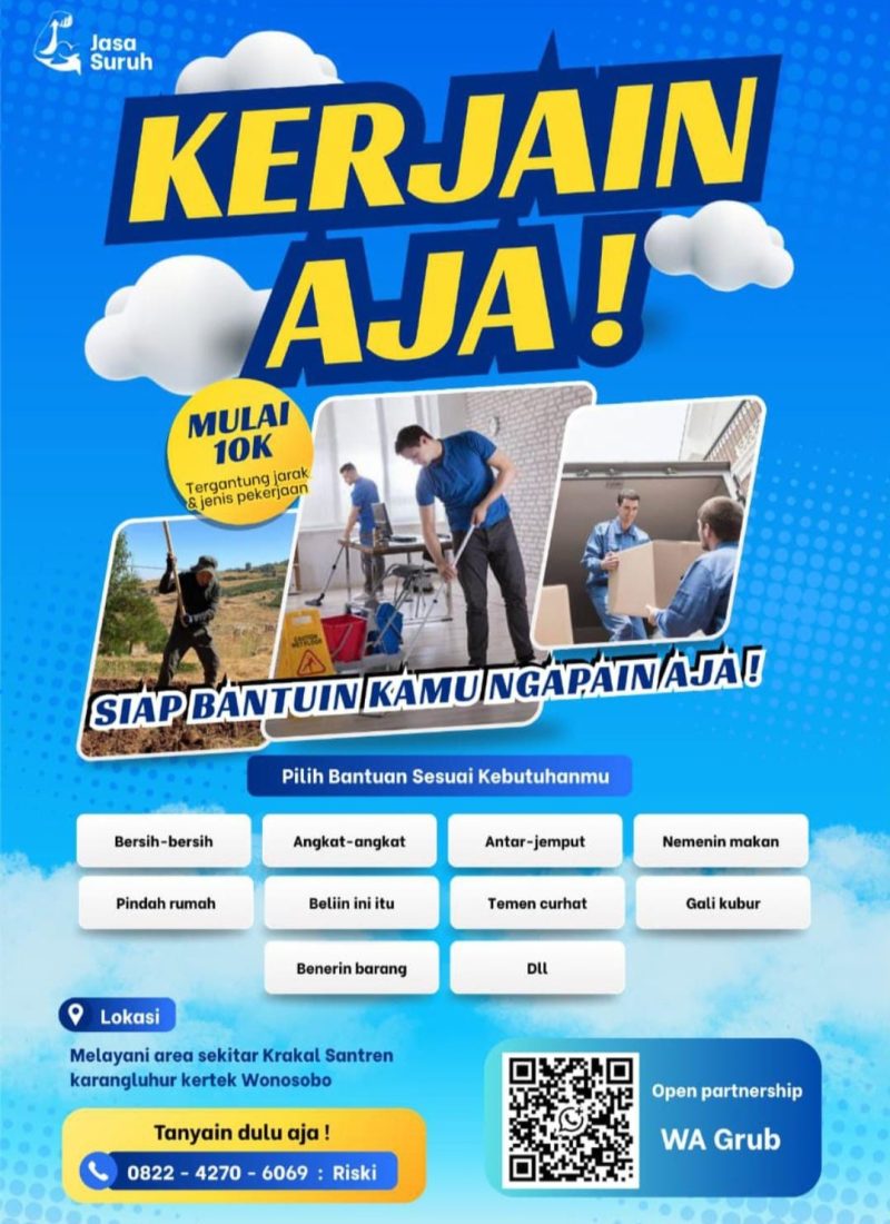 Layanan bernama “Jasa Suruh – Kerjain Aja!” ini menyediakan tenaga bantuan untuk hampir semua kebutuhan warga, mulai dari pekerjaan rumah, kegiatan fisik, hingga layanan khusus sesuai permintaan.